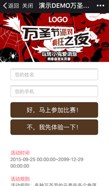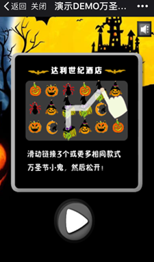 ? ? ? 填寫姓名和手機(jī)號(hào),馬上參加——不注冊(cè),先體驗(yàn)下——滑動(dòng)鏈接3個(gè)或更多相同款式萬(wàn)圣節(jié)小鬼,然后松開——限制時(shí)間內(nèi),連起的圖標(biāo)越多,得分越高——查看排行榜和規(guī)則