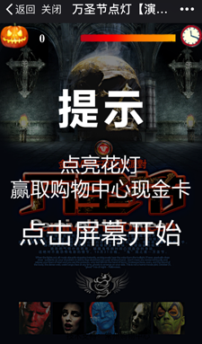 進(jìn)入游戲——開始注冊——點(diǎn)擊南瓜燈,贏取購物中心現(xiàn)金卡——限制時(shí)間內(nèi),點(diǎn)亮南瓜燈越多,排名越靠前——分享好友或者朋友圈——查看排行榜和規(guī)則