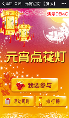 微信營(yíng)銷游戲——點(diǎn)亮燈籠模版,特別適合中國(guó)傳統(tǒng)節(jié)日的一種玩法,如果滿足您的需求,可以直接租用模版,如果有其它訂制需求,歡迎提交需求給我們,進(jìn)行進(jìn)一步溝通和開發(fā)。