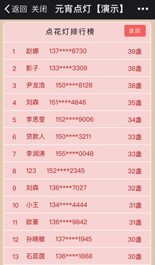 進(jìn)入游戲——開始注冊(cè)——點(diǎn)亮花燈,慶祝元宵——限制時(shí)間內(nèi),點(diǎn)亮燈籠越多,排名越靠前——分享好友或者朋友圈——查看排行榜和規(guī)則