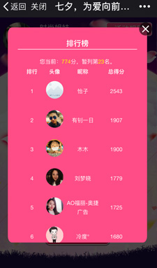 場景助力,中國傳統(tǒng)的情人節(jié),為愛向前沖,好玩樂趣的游戲,邀請好友助力玩,吸粉并強(qiáng)制關(guān)注。結(jié)合節(jié)日主題元素,游戲的推廣相當(dāng)好,大大超過商家預(yù)期。