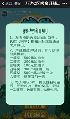 語音識別的游戲,用普通話喊出加油口號,開啟加油分貝挑戰(zhàn)。給予一定的獎品,刺激粉絲參與活動,宣傳商家品牌效果超過預期。