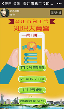 進入游戲——開始答題——限時答題——分享好友助力答題——查看規(guī)則和排行榜