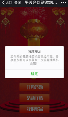 進(jìn)入游戲——開(kāi)始答題——活動(dòng)詳情——我的獎(jiǎng)品——錯(cuò)誤提示,全部答對(duì)可抽獎(jiǎng)紅包——分享好友送答題機(jī)會(huì)