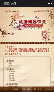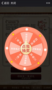 進(jìn)入游戲——養(yǎng)生貼士——第一重禮——完成問卷調(diào)查——第二重禮——參與大轉(zhuǎn)盤抽獎(jiǎng)——查看規(guī)則