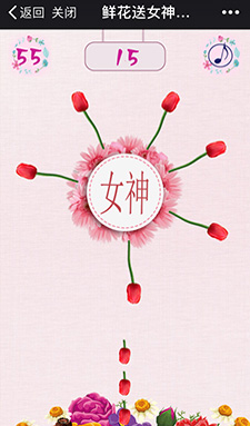 ? ? ? ?女神節(jié)送鮮花,針對(duì)女神節(jié)開發(fā)的微信營(yíng)銷游戲。游戲中點(diǎn)擊屏幕下方郁金香,并且向上滑動(dòng),往轉(zhuǎn)動(dòng)的花環(huán)種上鮮花,鮮花之間不能碰觸。邀請(qǐng)好友助力,收獲豪禮。游戲推廣效果顯著,以小成本,增長(zhǎng)了大數(shù)量的粉絲。
