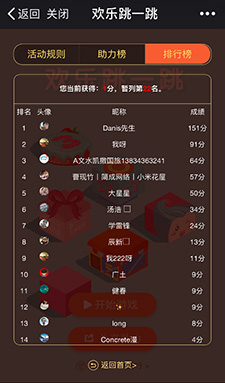 3、營銷點(diǎn):分享好友一起玩,通過排行榜發(fā)放獎(jiǎng)品;