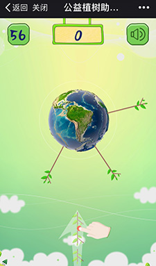 公益植樹(shù)助力版,針對(duì)植樹(shù)節(jié)開(kāi)發(fā)的微信營(yíng)銷(xiāo)游戲。游戲中點(diǎn)擊屏幕下方小樹(shù)苗,并且向上滑動(dòng),往轉(zhuǎn)動(dòng)的地球種上樹(shù)木,樹(shù)木之間不能碰觸。邀請(qǐng)好友助力,收獲豪禮。游戲推廣效果顯著,以小成本,增長(zhǎng)了大數(shù)量的粉絲。