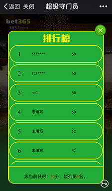進(jìn)入游戲——我要參與——12球內(nèi)根據(jù)守門成功獲得一定分?jǐn)?shù)——10球踢完游戲結(jié)束——召集好友——查看排行榜和規(guī)則