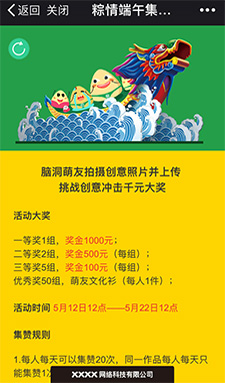 投票集贊游戲幾乎是每個節(jié)日營銷必備利器,粉絲參與度極高,上傳美照,分享好友進(jìn)行投票,根據(jù)排名可以得到豐厚獎品。游戲界面簡約,有濃濃的端午節(jié)元素,推出后備受歡迎。