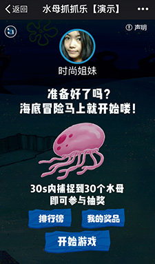 ? ? ? 進入游戲——開始游戲——30s內(nèi)捕捉到30個水母即可參與抽獎——我的獎品——查看排行榜