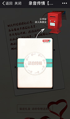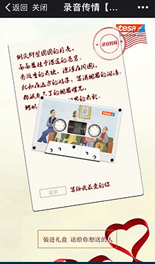 錄下想說的話,送給親人朋友,捎去安康。游戲帶有濃濃的節(jié)日情懷,發(fā)起錄音關(guān)注微信公眾號(hào),增加粉絲量,擴(kuò)大了朋友圈。