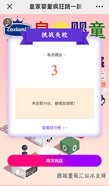 跳一跳小游戲的熱度高漲,根據(jù)跳一跳改版的歡樂(lè)跳一跳,是一個(gè)營(yíng)銷性活動(dòng)。這是一款可以植入廣告的跳一跳活動(dòng),達(dá)到分?jǐn)?shù)可領(lǐng)取禮券?;顒?dòng)推出后,實(shí)現(xiàn)幾千幾萬(wàn)粉絲參與,營(yíng)銷效果非常顯著。