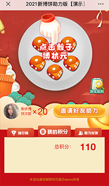 ? ? ? 進(jìn)入游戲——開(kāi)始博餅——活動(dòng)規(guī)則——每天x次擲骰子機(jī)會(huì)——邀請(qǐng)好友助力——查看積分榜,積分兌換——我的獎(jiǎng)勵(lì)