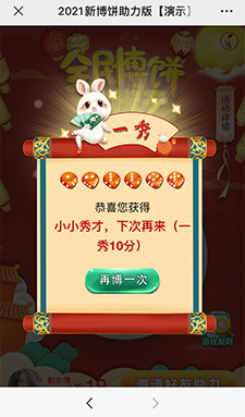 ????微信營(yíng)銷游戲——中秋博餅助力版 是經(jīng)典款微信公眾號(hào)推廣游戲,可以直接租用模版,如果有其它訂制需求,歡迎提交需求給我們,進(jìn)行進(jìn)一步溝通和開(kāi)發(fā)。