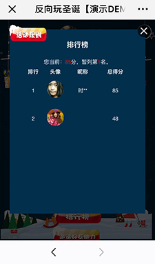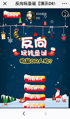 ? ? ? ? 反向玩圣誕游戲源于逆向思維的玩法,借助圣誕歡快的氛圍進行營銷活動,將圣誕樹、圣誕禮物、圣誕老人等元素融入游戲情節(jié),是用戶喜歡上游戲并且分享好友一起玩增加分數(shù),從而達到宣傳增粉的目的?;顒訒r間20天,頁面訪問量達到上萬,獨立用戶達到上萬。