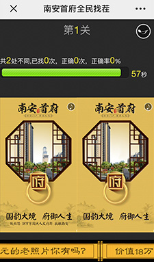 眼力大比拼全民來找茬,闖關(guān)類活動,界面廣告產(chǎn)品植入和游戲結(jié)合?;顒油瞥龊?,反響非常高,以小成本實現(xiàn)大價值。限制了游戲次數(shù),鼓勵分享朋友圈或者朋友,增加游戲次數(shù)。值得推薦的一款微信營銷活動。