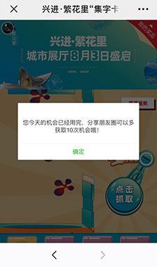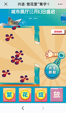 進(jìn)入游戲——點(diǎn)擊抓取——限制每天抓取次數(shù)——分享增加次數(shù)——集滿4個(gè)字可抽獎(jiǎng)——查看我的獎(jiǎng)品和活動(dòng)規(guī)則