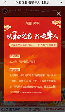 2、一旦整個(gè)字都畫完后,頁面上會(huì)出現(xiàn)提示的話術(shù):恭喜,你的新年“和”字已經(jīng)畫完!點(diǎn)擊【生成專屬海報(bào)】可以生成一個(gè)包含自己頭像昵稱的專屬海報(bào),上面會(huì)有一些隨機(jī)的祝福語,引導(dǎo)用戶填寫電話,填寫完成后,觸發(fā)抽獎(jiǎng)機(jī)制,有機(jī)會(huì)抽取現(xiàn)金紅包