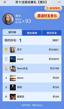 進(jìn)入游戲——填寫信息——自己有x次擊鼓機(jī)會(huì)——分享好友增加x次——查看排行榜和活動(dòng)規(guī)則