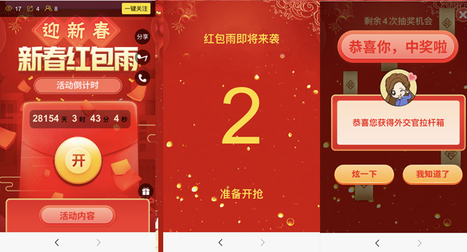 2、321倒計(jì)時(shí)后,屏幕從上往下隨機(jī)掉落紅包,點(diǎn)擊紅包進(jìn)行抽獎(jiǎng);