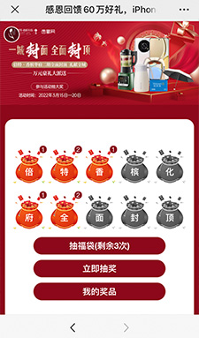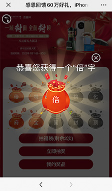 進(jìn)入游戲——抽福袋——自己有x次集字機(jī)會(huì)——分享好友進(jìn)行助力集字——集齊情況下可以抽獎(jiǎng),查看獎(jiǎng)品、獲獎(jiǎng)名單和活動(dòng)規(guī)則