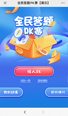 網(wǎng)絡(luò)實(shí)時(shí)答題活動(dòng),可試玩,也可邀請(qǐng)好友參與實(shí)時(shí)答題pk賽,玩法類似頭腦王者,累加的成績(jī)計(jì)入排行榜中。