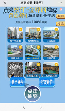 點(diǎn)亮城市地標(biāo),分享好友助力打卡地標(biāo),點(diǎn)亮所有地標(biāo)可進(jìn)行抽獎,線下核銷獎品,線上與線下活動密切結(jié)合,小成本實(shí)現(xiàn)大推廣。