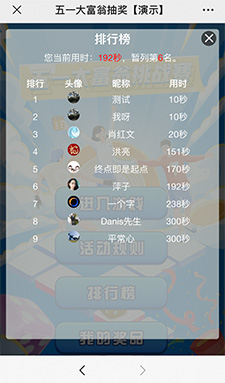 2、如果用戶在規(guī)定時間內(nèi)達到終點,就可以進入排行榜,活動期間用戶可以玩多次,但只取最短用時進入排行榜;