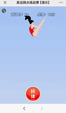 3、在10秒內(nèi)點擊轉(zhuǎn)體按鈕完成旋轉(zhuǎn)動作,轉(zhuǎn)圈數(shù)量越多,分數(shù)越高