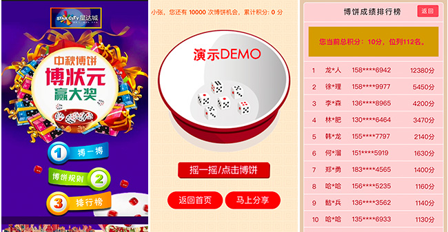 ? ? ? 中秋博餅五重奏:基礎版、美化版、吸粉版、助力版、多桌位版,這些微信游戲小系統(tǒng),結合了大多數(shù)客戶的需求,比如用戶登陸、用戶注冊、積分查詢、關注公眾號等。系統(tǒng)后臺開發(fā)上記錄了用戶信息,累積用戶每次博餅的積分情況,理清邏輯結構,然后采用php語言進行編寫,加上前臺界面美化,很完美的微信博餅游戲就在市面上推廣開來。