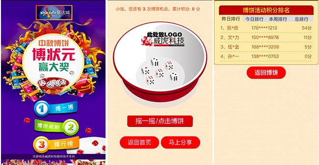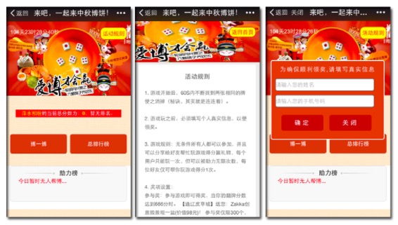? ? ?中秋博餅五重奏——五個微信中秋博餅游戲的模版,以上做了詳細的介紹,需要進行體驗歡迎登陸威虎科技網(wǎng)站進行查看,后續(xù)我們也出更多新版本的節(jié)日營銷游戲,請多指教,謝謝!