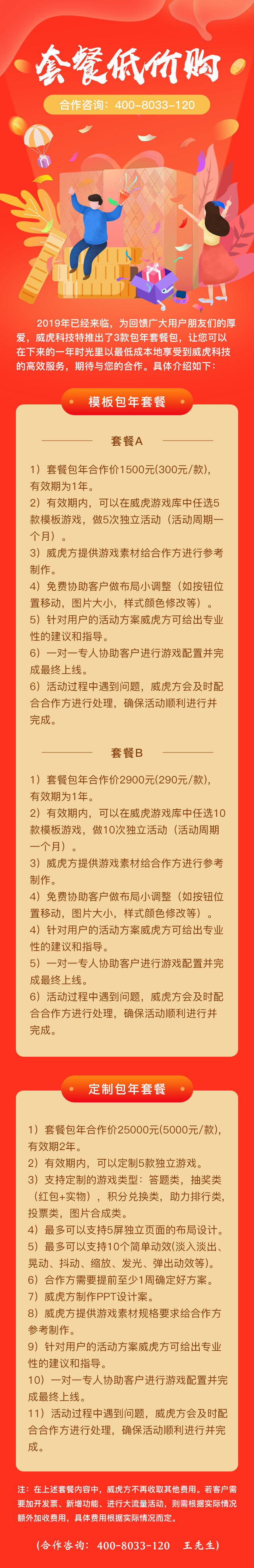 2019年已經(jīng)來臨,為回饋廣大用戶朋友們的厚愛,威虎科技特推出了三款包年套餐包,讓您可以在下來的一年時(shí)光里可以最低成本地享受到威虎科技的高效服務(wù),期待與您的合作。具體介紹如下: